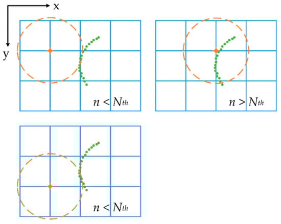 Figure 2 shows the process of pole candidate searching: the blue squares are the rasterized grids, the green points are the local point cloud projected on the X-Y plane and the orange circle is the searching field determined by a given radius whose center is the corner of the grid.