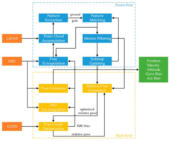 The whole system can be subdivided into the following parts: ground segmentation, pole extraction, pose extrapolation, scan-to-map matching, IMU preintegration and pose graph optimization. The flow chart is shown in Figure 3.