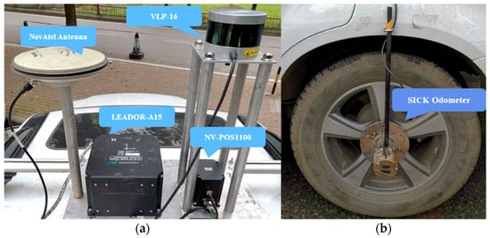 The reference system of this experiment consisted of IMU-A15 IMU—a high-level tactical-grade IMU with a laser gyroscope produced by the Leador Spatial Information Technology Corporation (Wuhan, China), a SICK-DFS60E-BECM02048 odometer (SICK, Waldkirch, Germany) and GNSS antenna from NovAtel (Calgary, AB, Canada). The experimental system was equipped with NV-POS1100—a quasi-tactical grade MEMS IMU (Sai MicroElectronics Inc., Beijing, China), Velodyne PUCK VLP-16 (Velodyne Lidar Inc., San Jose, CA, USA) and a common GNSS antenna with a reference system. The IMU-A15 IMU or SICK odometer were not used in the testing system. Figure 5 shows the equipments of the field test.