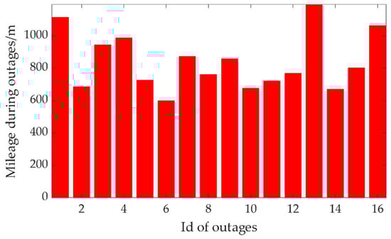 In the integrated navigation module, 16 mimic GNSS outages in two series of data were set to assess the performance. The shortest mileage of the testing platform during these outages was about 600 m, and the longest was about 1193 m in the plane, as shown in Figure 6.