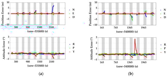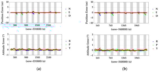 Position and attitude errors of the proposed integrated navigation system during GNSS outages: (a) errors of test #1 and (b) errors of test #2. The titles N, E and D represent the north, east and down directions, respectively, and R, P and Y mean roll, pitch and yaw.