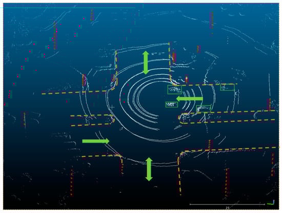 Point cloud at the 533,020th second of the week (in the 4th outage in Figure 8a). The red points are poles extracted by the algorithm mentioned above in Section 2.2; points in green boxes are laser reflections of the surrounding cars, and the point clouds are shown in white. The light green arrows are the directions of roads, and the orange dotted lines are the borders of accessible area.