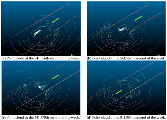 Point cloud collected when an abnormal heading angle error occurred. The laser reflections from the carriage of a van are in the green box. The light green arrow in each figure shows the driving direction of the vehicles, and the orange dotted lines show the borders of the road. The van was at the front-left of the experimental vehicle. (a–d) show the point cloud at different times, and they disappeared in sequence.