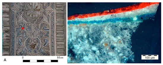 (A) Plasterworks in the intrados of the access gate of Carlos V room in Real Alcázar of Sevilla. The red dot highlights the area where the sample was collected. (B) Stereo microscope image of a sample taken from the Patio de las Doncellas in the Real Alcázar in Sevilla where there is presence of whitewash and red polychromy hiding its original blue color.