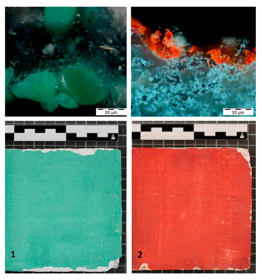 The proportion of pigment and binders was determined with the aim of creating a homogenous, opaque and covering layer over the plaster support to be able to assess adequately the data obtained from the cleaning tests. The proportion for the natural malachite was 10 mL/5 g, whilst the proportion of the cinnabar pigment was 10 mL/3 g [16].