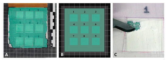 Due to the complexity of the cleaning processes it was essential to define exactly the areas of polychromy where the different treatments were applied to be able to extract the relevant data. So, following the methodology recommended by the Institute of Spanish Cultural Heritage in the project Nanorestart—EU Project (Nanomaterials for the Restoration of Works of Art) [21]—for interventions in contemporary works of art, we decided to design acetate transparent templates adapted to the surface of each assessed probe. In one of these templates 9 holes were made and each was assigned a selected cleaning process with a test area of 2 cm2. In each of these the number of the process was indicated with a permanent marker so that the condition before and after the treatment could be perfectly compared in each of the chromatic test surfaces (Figure 3).