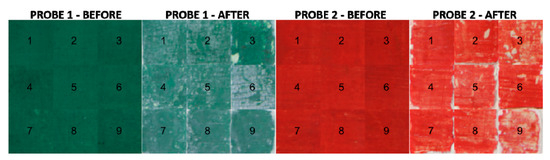 For each of the 9 samples in each probe, an area of 100 × 100 pixels was extracted both before and after the cleaning process. The sRGB renderization [37] of these areas is shown in Figure 4.
