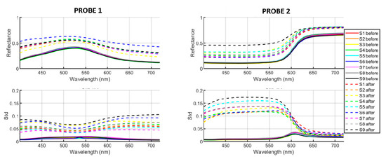 Mean spectral reflectances (top row) and wavelength-wise standard deviations (bottom row) of the 36 samples shown in Figure 4. Left column for probe 1 and right column for probe 2. Continuous lines represent the samples before and dashed lines after the cleaning process.