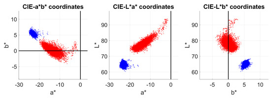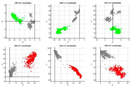 Figure 9 shows the L*, a*, b* clouds of both sets of pixels (pigment and white) for both probes. The top row shows the three two-dimensional projections of such a color space for probe 1. The green color represents pigment samples and the grey color the white samples. The bottom row shows the same for probe 2 (the red color pigment samples and the grey color for the white samples). As can be observed, the different samples are easily classifiable with the k-means algorithm.