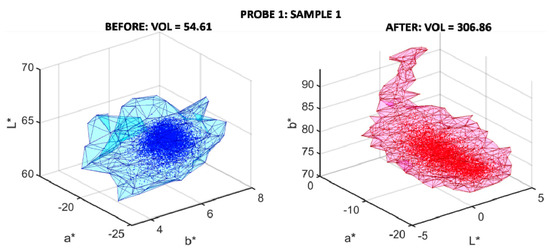 Minimum volume of the L*, a*, b* clouds of sample 1 of probe 1 before (left) and after (right) cleaning.