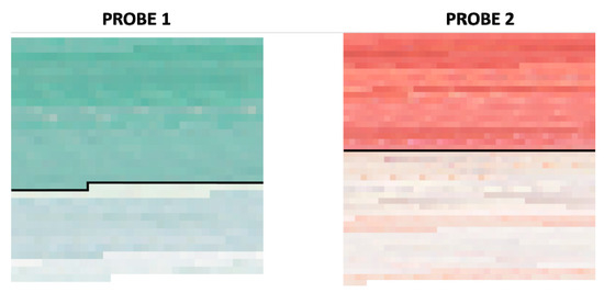 Regarding the results of the automatic segmentation of the white areas, Figure 10 shows example results of two different samples (sample 3 in probe 1 and sample 2 in probe 2). In this figure, automatically segmented white areas are highlighted in black (for easier visualization). In general, the results are satisfactory for all the samples and most white areas visually detectable were correctly segmented.