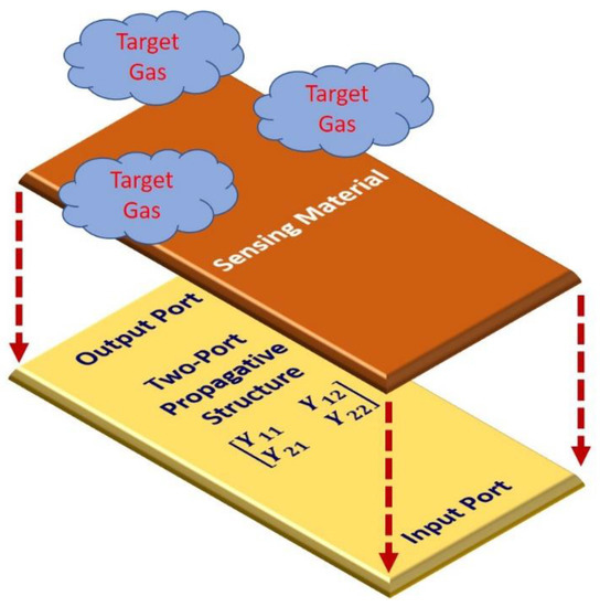 Illustration of the working principle of a gas sensor based on using a microwave device as a propagative structure and a sensing layer for gas detection. The two-port gas sensor is obtained by deposition of the gas sensing layer on the propagative structure and then exposure to the target gas.