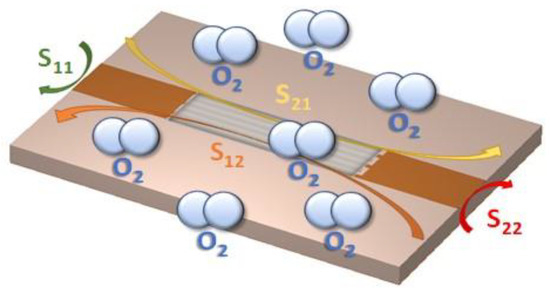 A microwave transducer consists of a microwave device, acting as an electromagnetic wave propagative structure, which is covered with a sensing layer, as illustrated in Figure 1. When exposed to the target gas, the sensing layer material interacts with the gas molecules and, consequently, the dielectric properties and the device electrical response are changed. Therefore, the changes in the target gas concentration influence the changes in the electrical response of the sensor. Often, the propagative structure is realized in the microstrip technology, such as microstrip patch antennas [24,25,26], microwave resonators [20,27,28,29,30,31,32], and other microstrip structures [35,36]. Among the various exploited structures, sensors based on the use of interdigital capacitors (IDCs) as propagative structures have been proposed [30,37]. The gas sensor considered in this work is a two-port IDC fabricated in microstrip technology and covered with a thick layer of titania (TiO2), as a sensitive layer. TiO2 is widely known in scientific literature as a sensing material, such as the resistive gas sensors developed by employing Pt-TiO2/MWCNTs (multi-walled carbon nanotubes) hybrid composites [52] and TiO2 coated carbon nanotubes prepared by atomic layer deposition (ALD) [53]. Furthermore, the sensing properties and photochromism of Ag-TiO2 nanoheterostructures were also evaluated [54]. The TiO2 metal oxide is suitable for the present purpose since the O2 molecules absorbed on its surface can be easily desorbed, even at room temperature [33,54]. The developed prototype is used as a probe for oxygen (O2) sensing. A possible application for this device is in oxygen therapy, where the O2 concentration is usually greater than 85%. The device could be also useful in spacecraft oxygen level detection; in these cases, the O2 concentration is above 60% [55].