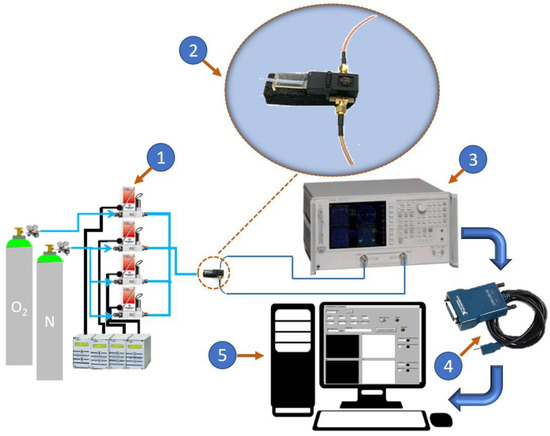 Illustration of the experimental set-up. It consists of five main blocks: (1) the controlled gas system, (2) the measurement chamber, (3) the vector network analyzer, (4) the USB/GPIB interface, and (5) the graphical user interface.