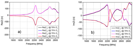 Frequency dependence of the (a) real and (b) imaginary parts of the impedance parameters at 70% of oxygen (O2) concentration.