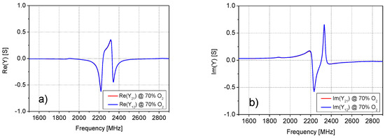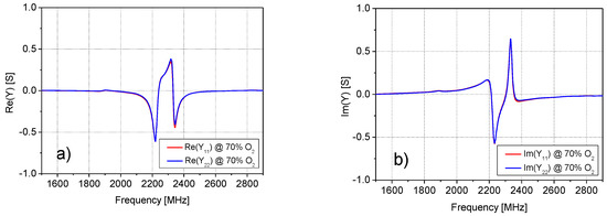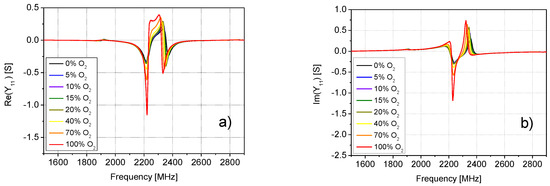By analyzing the admittance parameter Y11 for all considered concentrations of O2 (see Figure 8), it was concluded that a substantial variation of the admittance parameter was observed in the frequency range from 2.0 GHz to 2.5 GHz. Particular attention has then been devoted to this frequency range.