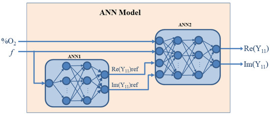 A modelling approach based on multilayer perceptron ANNs is proposed to model the behavior of the admittance parameters versus the frequency and the O2 concentration, as shown in Figure 9 [38]. Since the admittance parameters closely satisfy the condition Y11 = Y22 = Y12 = Y21, it is enough to develop a model only for the parameter Y11. For that purpose, an ANN having two outputs referring to the real and imaginary parts of Y11 should be trained by using the values of the measured Y11. The ANN has two input neurons corresponding to the O2 concentration and frequency (see ANN2 in Figure 9). Moreover, the proposed ANN has, besides the two mentioned inputs, two additional inputs referring to the real and imaginary parts of Y11 at a reference concentration. Namely, in order to ensure the modelling accuracy, a so-called prior-knowledge-input neural modelling approach is adopted [56]. The PKI approach assumes that the ANN has additional inputs, which are correlated in a certain way to the ANN outputs, with the aim of more easily achieving the desired accuracy with the available set of data. As the prior-knowledge, Y11 at a chosen reference O2 concentration is exploited, since the shape of the frequency-dependent behavior of Y11 is roughly similar for all concentrations. For determining Y11 at the chosen reference frequency, an additional ANN is considered, namely ANN1 in Figure 9. It has one input and two output neurons. Both ANNs can have one or two layers of hidden neurons. The number of hidden neurons is determined during the ANN training process, as it is not possible to determine it a priori. Namely, for each ANN, ANN structures with a different number of hidden neurons are trained and then, after comparing their accuracy, the best one is chosen as the final model.