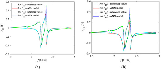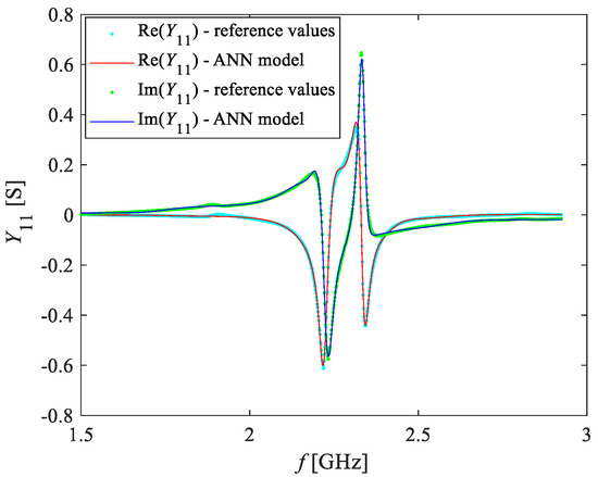 In the present case, the values of Y11, calculated from the measured S-parameters, were available at the following O2 concentrations: 0%, 5%, 10%, 15%, 20%, 40%, 70% and 100%. Upon analysis of the behavior of Y11 at these concentrations, 70% was selected as the reference concentration of O2. Therefore, ANN1 was trained with the data of Y11 referring to this concentration. The best ANN was the one with two hidden layers having five hidden neurons each. This ANN accurately mimics the real and imaginary parts of Y11, as can be seen in Figure 10.