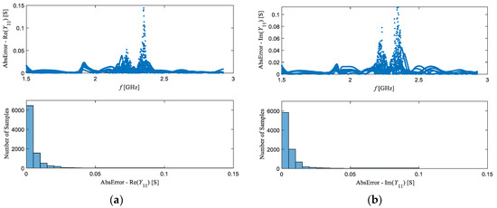Frequency dependence and histograms showing the distribution of absolute values of the difference between the measured Y11 and the corresponding values obtained by using the ANN model: (a) Y11 real part; (b) Y11 imaginary part.