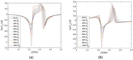 The developed ANN model can be used to accurately predict the frequency-dependent behavior of Y11 for any O2 concentration value in a range of 0% to 100%. To illustrate this, Figure 13 shows the real and imaginary parts of Y11 at O2 concentrations with a step of 10%. The plots confirm that changes in the O2 concentration are clearly transduced into variations of Y11. In particular, there is a shift of the peaks and dips in the spectrum and there is also a change in their amplitude. At certain frequencies, the imaginary part of Y11 becomes null and thus this parameter is purely real. At these frequencies, the device resonates, and it is possible to relate the change in the resonant frequency to a change in the O2 concentration. Namely, three resonance frequencies can be identified, let them be named f1 (around 2.21 GHz), f2 (around 2.33 GHz), and f3 (around 2.38 GHz).