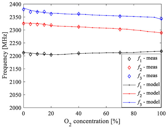 Based on the analysis of the imaginary part of Y11 at different O2 concentrations, the resonant frequencies were read from the measurements and from the ANN model simulations, which were performed with a step of 5%. The obtained results are reported in Figure 14. It can be seen that the values obtained from the simulations agree very well with the values obtained from the measured Y11 for all considered concentrations. This demonstrates the accuracy of the developed ANN model and its generalization capability, enabling prediction of the resonant frequencies even at O2 concentrations different than the ones used during the experimental characterization.