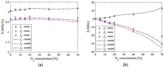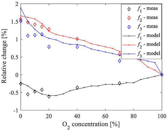 To investigate the suitability of the resonant frequencies as sensing parameters of the O2 concentrations, the sensitivity and the relative change versus the O2 concentrations are investigated. Figure 15 illustrates the absolute-absolute sensitivity and absolute-relative sensitivity of the resonant frequencies to changes in the O2 concentration by using 100% of O2 concentration as the reference value. The absolute-absolute sensitivity is calculated as , whereas the relative-absolute sensitivity is calculated as . is the considered resonant frequency at a certain and is the corresponding resonant frequency at 100% of O2 concentration. For the sake of completeness, the relative change of the resonant frequencies, expressed as a percentage, is calculated as and the achieved results are given in Figure 16. It should be highlighted that f1 exhibits positive values for both sensitivities, whereas f2 and f3 have negative sensitivities. Figure 15a shows that the absolute-absolute sensitivity is roughly insensitive to the concentration of O2 for all of the three resonant frequencies. On the other hand, Figure 15b shows that the absolute values of the relative-absolute sensitivity increase linearly with the concentration of O2 for all of the three resonant frequencies. Although the sensitivities of the three resonant frequencies show similar behavior, the highest absolute values are achieved when using f2 and f3. (see Figure 15a,b). Therefore, these two resonant frequencies allow achieving an enhanced sensitivity of the proposed sensor for oxygen sensing. As the discrepancies between measured and simulated data are slightly larger when using f3, it can be concluded that f2 is the resonant frequency to be chosen as the sensing parameter in the present case.