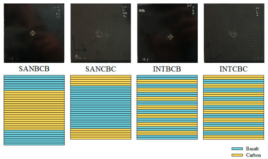 All of the specimens involved in this study were manufactured with plain weave basalt (220 g/m2) and carbon (160 g/m2) fiber epoxy prepregs and formed in an autoclave using the same epoxy matrix (DT150). In the prepreg lay-up process, plain weave fiber layers were stacked with a 0/90° sequence. Then, during the forming process, all specimens were cured in SAN and INT structures, as shown in Table 1 and Figure 1.
