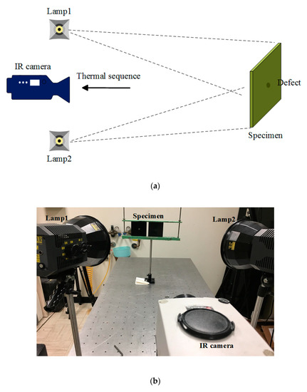 Infrared thermography (IRT), as a widely used non-destructive testing method, has been increasingly studied as an alternative owing to its advantages, such as contactless inspecting mechanism, high spatial resolution, fast inspection rate, as well as advanced thermographic imaging techniques. IRT involves different thermal excitation methods, e.g., optical excitation thermography (OET), laser excitation thermography, vibrothermography (VT), and induction thermography [4]. In OET, the surface of the sample is heated by a flash lamp array and halogen lamps. Meanwhile, the thermal sequence of the subsequent cooling stage of the surface is recorded by a thermal camera. OET is a non-contact technique with a relatively large inspecting area [5,6]. Laser excitation thermography uses a laser beam as a thermal source. This excitation method is more suitable for micro-sized flaw detection tasks in composites, considering the structural complexity, which leads to abnormal thermal diffusion when conventional IRT techniques are adapted [7,8]. In VT, the sample is excited by an elastic wave from mechanical vibration. The mechanical energy is converted into thermal energy during the propagation of the damp acoustic waves, while energy dissipation in the vicinity of defects is more obvious due to the friction at the surrounding area [9,10,11]. Induction thermography is a non-contact, real-time measurement method over a large region, which is effective for the evaluation of composites with electrical conductivity, such as carbon fiber reinforced plastic (CFRP) [12,13]. Apart from studies on imaging techniques, extensive research on infrared processing methods have also been carried out. Advanced signal processing plays an essential role in IRT owing to its capability to extract latent information from high dimension data and enhance the contrast, which ultimately leads to an increased probability of detection and reduction in false alarm rate. The thermal signal reconstruction (TSR) algorithm is commonly implemented to reduce the noise level of thermal image sequences [14,15]. Principal component thermography has also been proposed as an infrared data processing technique to extract image features and reduce undesirable signals [16]. Pulsed phase thermography has been demonstrated as effective for spectral information mining in which amplitude and phase patterns could be extracted for further spectral analysis [17]. Nowadays, the virtual wave concept has become a popular topic in thermographic signal reconstruction [18,19]. This technique calculates the virtual wave from the measured temperature signal and then generates the output with an ultrasound reconstruction method, such as frequency domain synthetic aperture focusing technique (F-SAFT). Inspired by deep learning, the virtual wave reconstruction technique has been extended by adapting deep neural networks trained with synthetic data [20]. The performance of deep neural networks outperformed the model-based Stolt’s f-k migration method on both simulation and real-world data.