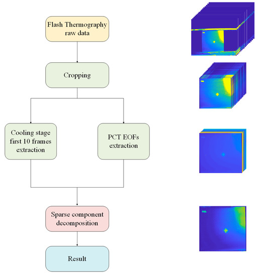 In this work, the whole signal processing framework based on sparse pattern extraction is illustrated in Figure 4. First, the thermal sequence was preprocessed to extract typical information. The preprocessing pipeline included a cropping operation and typical components extraction. Direct frame extraction was performed when the task required more on-surface information, while PCT was adopted when the task focused on defects appearing on sub-surface layers. PCT relies on singular value decomposition (SVD) to project data onto empirical orthogonal functions (EOFs). In addition, it is worth noting that the typical component extraction aims at dimension reduction in order to reduce the computational complexity of the sparse component extraction process. Then, sparse patterns are extracted with sparse component decomposition techniques based on different assumptions and constraints. In this work, sparse component decomposition techniques were adopted to separate the defect information from the background and thermal noises. The tensor was decomposed into low-rank and sparse components; the sparse component referred to the defect information, while the low-rank component was inherent to the background information. In the following parts of this section, we introduce several effective sparse component decomposition techniques that are involved in the experiments.