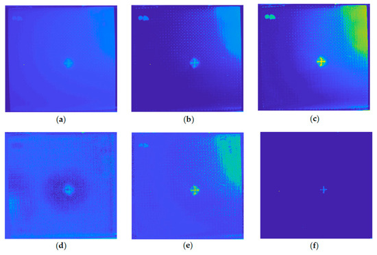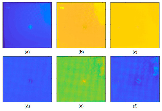 Figure 5a shows the pseudo color image of the frame extracted from the thermal sequence recording the flash thermography experiment on the INTBCB specimen. The extracted frame is the frame following the peak temperature (flash excitation), which has a high contrast of the impact-induced surface damage area and the normal area without impact. It is obvious that the cross-shape surface crack induced by impact could be found on this frame due to the different thermal conductivity on the composite material and air remaining in the crack. Figure 5b illustrates the temporal temperature profile on points from different locations. The difference existing in the temporal temperature profile is the base for further signal processing algorithm implementation, which aims at enhancing the spatial contrast. Figure 6 presents the PCT results of the thermal sequence. Six EOFs extracted by PCT from the thermal sequence conducted through flash thermography are shown. It is clear that the surface crack information is recorded in EOF 3 and 4, while the EOF 2 and 6 contain the orientation information of the woven fiber. EOF 5 records the impact-induced damage caused in greater depth. EOF 1, as the main component, merges all of the information described above. In the PCT results, some structural patterns and defect information could be preliminarily observed. However, these patterns are scattered in several components. This indicates that PCT is suitable as a data preprocessing step. Sparse component decomposition is then adopted to integrate the information with sparse features to obtain high contrast outputs.
