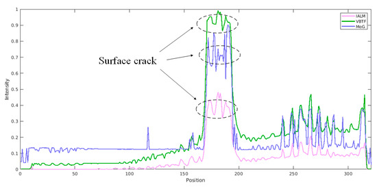 In order to provide a more precise comparison, three sparse pattern extraction methods with significantly superior performance than those shown in Figure 7 were chosen for further intensity distribution and contrast analysis. Figure 8 illustrates the intensity distribution acquired by different processing methods with a fixed horizontal location x = 167 and variant vertical position. It can be concluded from this intensity distribution curve that the VBTF processing result shows the highest contrast on the surface crack area compared with other sparse pattern extraction methods. In addition, comparison results on all four kinds of hybrid fiber-reinforced laminates are illustrated in Figure 9. It is worth noting that all three effective algorithms involved in this comparison extract the surface crack, impact-induced damage, and surface fiber orientation successfully. Moreover, the enhanced VBTF model shows even higher contrast on the surface information and is proven to be more suitable for the implementation on the enhanced infrared sparse pattern extraction framework in general laminates evaluation. On SANCBC and INTCBC samples, the enhanced MoG algorithm improves the contrast on the defect area, while the fiber orientation and composite structural information are not preserved. The defect information extraction and background interference elimination capabilities make the enhanced MoG algorithm more suitable for the detection tasks of sub-surface defects in complex surface situation and great depth. All in all, these three enhanced sparse component decomposition algorithms have their own applicable scenarios in composite inspection using IRT. The practical industrial implementation requirements according to the specific detection task must be taken into account when selecting the appropriate algorithm.