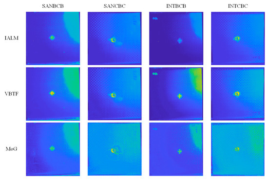 Comparison on the enhanced sparse pattern extraction results of the INTBCB specimen: (a) PCT; (b) IALM; (c) VBTF; (d) PRMF; (e) MoG; (f) IRTPCA.