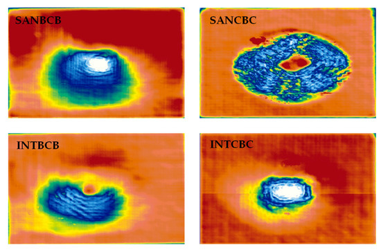 In order to verify the efficacy of this enhanced infrared sparse pattern extraction framework, some widely used non-destructive testing methods were involved for comparative purposes. Ultrasonic testing was performed (illustrated in Figure 12). A probe (Olympus Panametrics-NDT A310S, 5 MHz) was adapted to induce the elastic wave and receive the echo. An Olympus OmniScan MX was used for data processing and visualization. A robotic GLIDER X-Y Scanner was used for raster scanning, and a water tank was used to contain the coupling medium required for this experiment. In Figure 12, the results of four composite laminates are shown. Compared with the proposed enhanced infrared sparse pattern extraction framework, the results of ultrasonic testing have the characteristic of low spatial resolution. From the results, the existence of impact-induced damage can be detected, while the morphology of impact-induced damage cannot be specifically observed due to the limitation of low spatial resolution. Interestingly, in the SANCBC sample, the delamination around the impact-induced damage is completely revealed by ultrasonic testing. This delamination is identified in the CT results (side view of SANCBC in Figure 2), which are near the other side of the impact surface. Moreover, in the other three samples, the heterogeneous distribution of resin can be observed in the results of the ultrasonic testing. The delamination information is also revealed in the results of the proposed framework (in Figure 9), while the completeness is not better than the results produced by ultrasonic testing. Unfortunately, the resin-rich area is not detected in the results of the proposed framework due to the limitation of thermal energy excited by the flash lamp. Therefore, in practical industrial implementation, the proposed framework is more suitable for high-speed preliminary detection of surface or subsurface defects. In subsequent work, the defective samples confirmed by high-speed preliminary detection will be subjected to ultrasonic testing for further delamination detection and internal structure analysis.