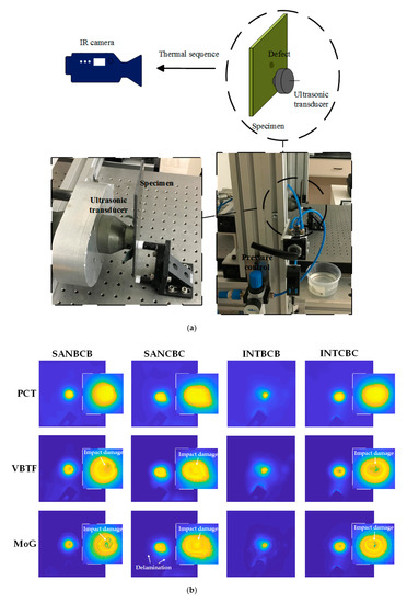 Validation using vibrothermography on four composite laminates: (a) Schematic configuration of vibrothermography; (b) Data processing results of PCT, enhanced sparse pattern extraction using VBTF and enhanced sparse pattern extraction using MoG; (c) The second sparse pattern extracted with MoG from the INTBCB and INTCBC specimens.