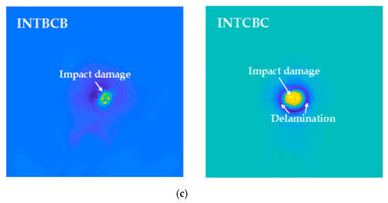 Vibrothermography was also conducted (shown in Figure 13). The same IR camera as PT was used in the vibrothermography experiment with the same frame rate (55 Hz). The transducer was pressed against the specimen, and two periods of 0.2 Hz (10 s) lock-in ultrasonic waves were delivered. In Figure 13b, data processing results of four composite laminates are shown. Owing to the excitation method, vibrothermography has a stronger capability on internal structure inspection than PT. Correspondingly, this kind of IRT approach sacrifices the surface and sub-surface information compared with PT. The PCT results of all of the specimens only revealed the location of the impacted area, while neither the morphology of the impact-induced damage nor the fiber orientation was inspected. After processing with the proposed enhanced sparse pattern extraction framework using VBTF and MoG, part of the surface and sub-surface defect information was extracted into the sparse pattern, e.g., impact-induced damage in rhombus shape in the SANBCB specimen, damage in the shape of a circle in the SANCBC specimen, and circular damage in the INTCBC specimen. This is particularly evident in the zoom-in enlarged figure of the impacted area in Figure 13. It is worth noting that the proposed enhanced infrared sparse pattern extraction framework has robustness and generalization capabilities, which could also improve the defect information from another modality of thermal excitation. As discussed before, the enhanced MoG algorithm is more suitable for sub-surface defect detection. It could be combined with the characteristics of vibrothermography to further extract the internal structure information. Thus, the enhanced MoG algorithm is a preferred choice for vibrothermography data processing. Two interesting points can be further observed in the results of enhanced infrared sparse pattern extraction using MoG. One is the delamination around the impact-induced damage area in the SANCBC specimen (clearly indicated in the ultrasonic testing results, Figure 12) that is revealed in the processing result of enhanced MoG, as shown in Figure 13b. Another aspect is the fact that the second sparse pattern extracted with the enhanced MoG contains higher contrast impact-induced damage morphology information. In the previous experiments, especially those using PT as the thermal excitation modality, the main sparse patterns were selected as the results of the enhanced sparse pattern extraction framework because the impact-induced damage always existed in the pattern with the highest sparsity. However, the second sparse pattern extracted with the enhanced MoG successfully revealed the defect information, which was not presented in the main sparse pattern of INTBCB and INTCBC (shown in Figure 13c). The reasonable explanation of this phenomenon is that vibrothermography mainly extracts internal and sub-surface information, while extremely limited surface information can be gathered in original data. This results in the main sparse pattern concentrating on the internal structure and limited surface information being distributed into the second sparse pattern. To summarize, the enhanced MoG on vibrothermography data could reveal sub-surface and internal information of composite laminates. This also provides effective information compensation for PT in practical industrial inspection tasks.