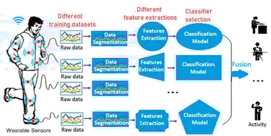 Most works on multi-sensor fusion are based on decision-level fusion. Compared with the other two fusion methods, decision-level fusion can process heterogeneous sensor information with less communication bandwidth consumption. Correspondingly, this paper is based on the decision-level fusion method, which combines the information of several simple classifiers and establishes an ensemble system that includes a one-to-one relationship between classifiers and sensors. The designed structure of multi-sensor fusion with ensemble learning system is shown in Figure 2.