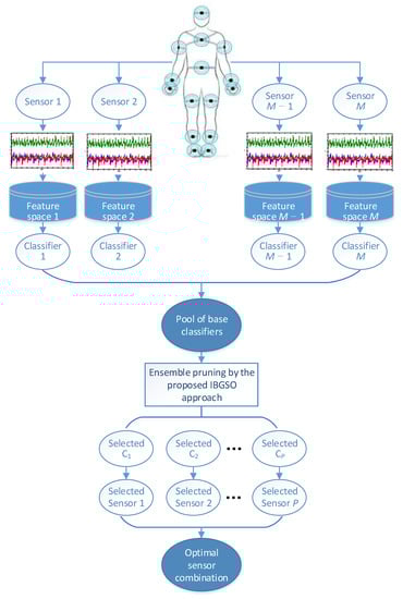 Selective ensemble, which is also known as ensemble pruning, is an approach for extracting a subset of classifiers that optimizes the performance of ensemble learning system. Ensemble pruning approaches can be categorized into three main groups: ordering-based [,], optimization-based [], and clustering-based [] pruning approaches. Ordering-based selection is first based on an evaluation measure (or criterion) that ranks every classifier and then aggregates the ensemble members whose ranks are above a predefined threshold. Clustering-based pruning approaches consists of a clustering technique, which allows identifying a set of representative classifiers that compose the pruned ensemble. Although these methods have less computational cost, the ensemble performance may not be optimal. In addition, for the above two approaches, there is no ideal way to choose the scale of the ensemble learning system. Comparatively, optimization-based approach treats ensemble pruning as an optimization problem, which makes it easier to obtain the optimal ensemble. In addition, there are many heuristic algorithms that can be used as a searching strategy to find the optimal sub-ensemble, such as the genetic algorithm (GA) [], particle swarm optimization (PSO) [], ant colony optimization (ACO) [] and glowworm swarm optimization (GSO) []. However, there are few studies [] that applied the effective optimization-based pruning approach to design the layout of the multi-sensor for HAR system.
