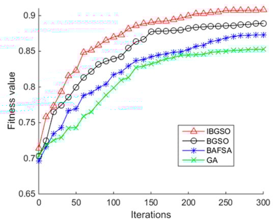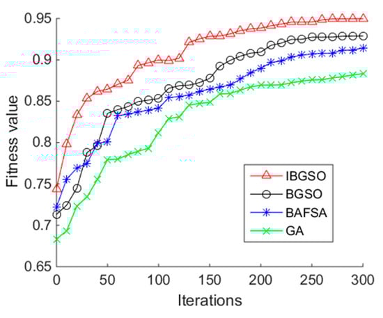 Figure 5 shows the fitness evolutionary curves of the four heuristic algorithms. From Figure 5, it can be seen that the proposed IBGSO has better convergence and search performance than the other three binary heuristic algorithms overall. In the early phase of the algorithm iteration, the proposed algorithm has a rapid improvement of fitness value compared with the other three algorithms. In the middle phase of the algorithm iteration, the fitness value slowly increases and until the latter phase of the iteration, the fitness curve, levels off. After the 250th iteration, the fitness value of IBGSO cannot be significantly improved.