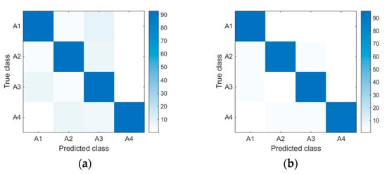 Additionally, the confusion matrixes for the ensemble of all approaches and the proposed IBGSO-based ensemble are constructed in Figure 6 to show a better insight into the effectiveness of the proposed method in optimizing sensor deployment. Figure 6a shows the result of the ensemble of all approaches and Figure 6b shows the results of the proposed approach. It can be seen from the comparison that there are major confusions among activities, such as A1 and A3, A2 and A3 and A2 and A4 in the ensemble of all approaches, while the proposed IBGSO-based approach increases the discrimination of these activities. Therefore, the HAR method proposed in this paper can effectively reduce the number of sensors and improve the recognition performance.