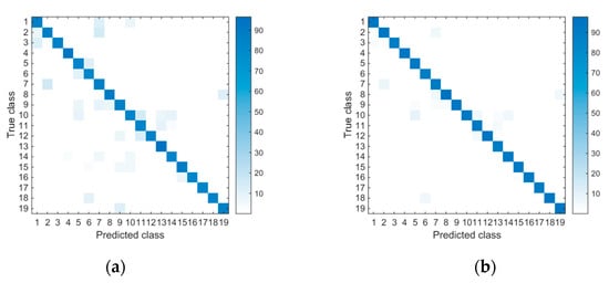 Confusion matrices for the ensemble all approach (a) and the proposed IBGSO-based ensemble approach (b) using the OPPORTUNITY dataset.