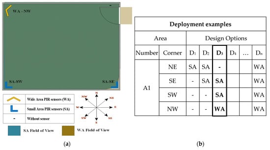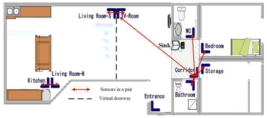 The first step in testbed design is sensor deployment. To have a sensor in each individual area of the house, a number of options for the sensor layouts can be selected due to the house floorplan and the required areas for monitoring. Sensors can be mounted at different corners of each area attached to the wall or ceiling. Their effective range (approximately 10 m), the sensing point of view, plus their sensing angle will directly affect the data collection quality and the number of recorded events. The sensing angle depends on what type of sensor is chosen for installation, i.e., either using small area sensors (small angle—SA—with a less than 180° field of view) or wide area sensors (wide angle—WA—with detecting angle up to 360°) or even choosing no sensor placement. Since we chose to mount the sensors in a paired way to cover every entrance of the home and detect the transitions in our proposed solution, the number of possible layouts will be limited. In addition, the limitations caused by the building architecture and in some cases the furniture’s location, reduce the number of deployable layouts to fewer possibilities.
