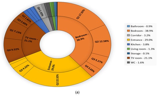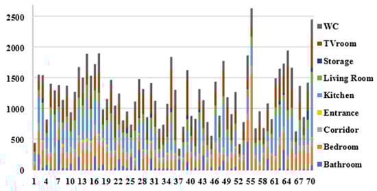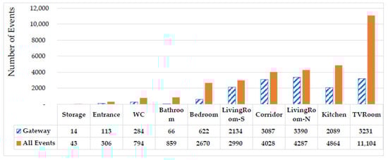 In addition, the number of captured events per location can reflect how much of subject’s activities are assigned to perform a specific task such as personal hygiene activities, cooking, and eating. Figure 14 shows the total number of captured events per location for our 70-day testbed.