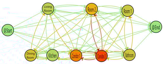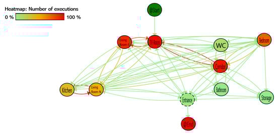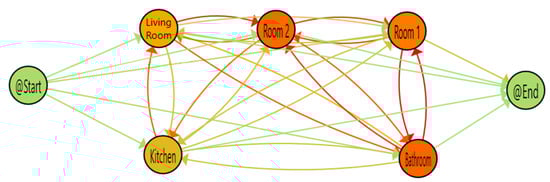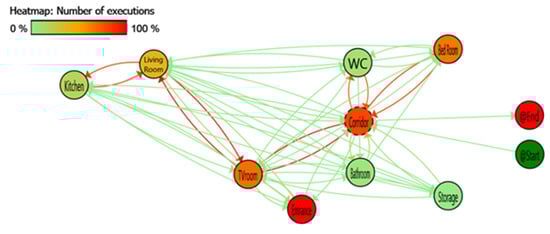 By considering the physical layout of the building and assuming that the case study subject follows a logical pathway between areas, jumping between areas will be impossible; hence, all captured events must follow logical sequences based on the building floorplan. In this way, the applied pairing setup can provide the required sequence of events in order to assist the validation process of collected data. For instance, transitions between the Bathroom to the WC and the storage to the TV-room are not physically possible due to the floor plan as shown in Figure 5. Furthermore, the resident notes can assist us for overall validation of the collected data. Using the process mining tool PMApp [41] and the PALIA algorithm [40] it is possible to create a view of the whole process, an aggregated model of the resident pathway during the studied period.