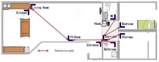 For data collection purpose, the environment is equipped with connected PIR sensors to generate readings with an added timestamp to record sequences of resident’s daily activity. The PIR sensors are mounted in such a way that a sensor is located in each individual area of the house and their sensing angles are adjusted to cover the entrance of area as well. In addition, sensors are paired so that passing each doorway of a house will inevitably lead to the capturing of two events: one due to the triggering of the corresponding sensor within the room and one by the sensor in the adjacent area. Hence, if we consider two sensors that are installed in two adjacent areas as a pair, whenever two consecutive events of these two pairs of sensors are observed in the recorded data, it indicates passing of the doorway and the direction of movement (entering or leaving the area) can be also determined according to the sequence of these two recorded events. In other words, when a person enters any area/room in the home, an event is recorded by the corresponding sensor within that area and transmitted to the base (sink) node. These capturing and transmitting packets by the sensor will continue as long as the person moves in that area. Further, by leaving that area, the paired PIR sensor, which is located outside of that area, will detect and start to capture the movements. In this way, the tracking process will continue in the whole areas of a home by a network of PIR sensors.