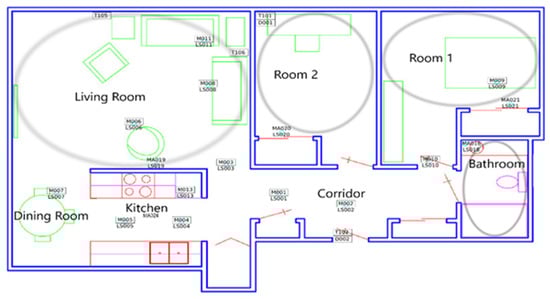 Installed sensors in CASAS testbed are placed to strategically track all the movements and activities of the inhabitant inside different rooms of the house (including kitchen, living room, bathroom, dining room, bedrooms, and corridor). The sensors used in specific locations of the building such as ceiling to cover the whole area of places or on top of devices like refrigerator as well as bed and chairs in the living room [45].
