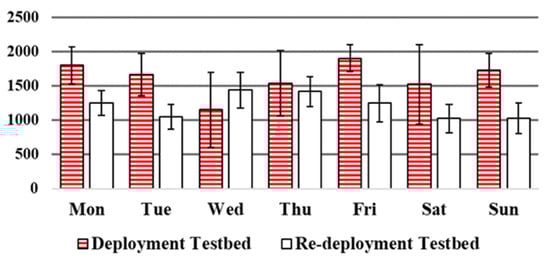 Figure 16 shows the resident activity volume with “no event” to be the case of being out of home, “<50 events per hours” for a low activity and sedentary state (such as sleeping, studying, and watching TV), and “>50 events per hour” for a high activity level (such as taking shower, cooking, washing dishes, and house cleaning). Results show that the total number of “<50 events per hour” for both weekdays and weekends are recorded more in the re-deployment compared to the deployment phase due to higher precision of event detection as a result of lower number of sensors and reduced overlapping coverage areas—this can match results presented in Table 1 and Table 2—“>50 events per hour” is recorded less as a complementary to the increase of the low event record registration.