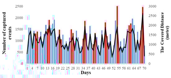 The inhabitant’s daily covered distance can be estimated by knowing the apartment’s floorplan and the placement of sensors within the apartment. The dimensions of the rooms, distances between the centre of each area with the next one and distances between sensors are calculated accurately. Then, for every pair of events captured by a single sensor, two points are selected randomly within that area or two points are selected from two adjacent areas for every captured transition and then the distance between these two points is calculated. Adding all of the calculated distances throughout the day provides an approximation of the daily total covered distance. Note that this approach does not consider the existence of walls or other obstacles in the path of movements and assumed the resident walked in a straight line from the area covered by one sensor to another area covered with different sensor. Figure 15 presents the covered distance and the number of captured events for each day in re-deployment testbed dataset. The red bars indicate the weekend days; our subject is more active over the weekends as spending more time at home.