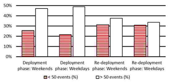 The average percentage of hours in a day for three activity levels of more than 50, less than 50, and no event for deployment and re-deployment testbed during weekdays and weekends.