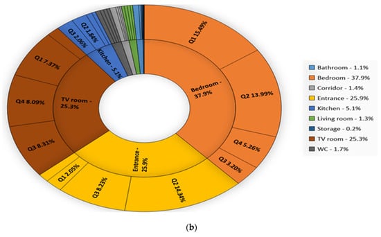 The time duration spent in every location of a home and in various times of a day can be linked to different tasks and activities. Hence, we compute this amount of time for the collected 70-days dataset and calculate the average time spent in each location for both weekdays and weekends. In addition, we split a day into four time periods: Q1 from 00:00 to 05:59, Q2 from 06:00 to 11:59, Q3 from 12:00 to 17:59, and Q4 from 18:00 to 23:59, and calculate the average time spent in each quarter. The results presented in Figure 17, the home resident spent 38% and 39% of his/her time in the bedroom for sleeping and studying in weekends and weekdays, respectively. Furthermore, we observe second highest duration recorded at the entrance point which represents the time the resident being out of home for each day (mainly in Q2). The resident stays out of home 3.1% more in weekdays compared to weekends and 21.3% of this increase is happened in Q2 time interval including working hours and almost 2% decrease happened in being out of home within Q4 time interval for weekdays. This shows that the resident tends to go stay home after working hours in weekdays. Furthermore, the residents watch TV 4.2% more in weekends, a third of which is in Q3 period (i.e., typical working hour in weekdays).
