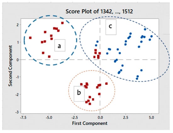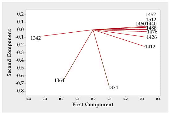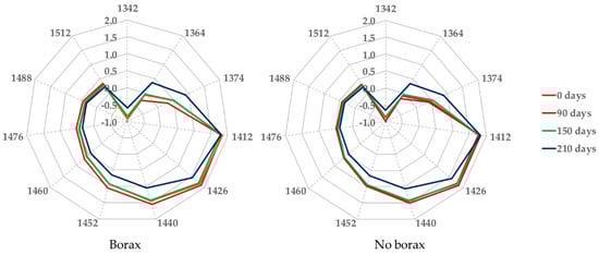 10] to verify the suitability of the holistic aquaphotomics approach in highlighting the differences arising between borax and no borax samples during the storage. Excel spreadsheet (Office 365, Microsoft Corporation, Redmond, WA, USA) and MINITAB 17.0 statistical software (Minitab Inc., State College, PA, USA) were used for data processing. Repeatability between replicates was verified. Aquagrams were built up at time 0 and during storage (at 90, 150, and 210 days after the jar packaging), both for “borax” and “no borax” sets of samples. Principal component analysis (PCA) was applied (95% of confidence level) to the whole dataset, selecting the wavelength regions from 1300 to 1550 nm. Outlier detection in the multivariate space was carried out using the Mahalanobis distance criteria: observations falling above the critical distance were labeled as outliers and removed. The principal component analysis allowed the extraction of useful information from the dataset, the exploration of its structure, and the global correlation of the variables. Subsequently, using the most uncorrelated frequencies (i.e., 1342, 1374, and 1426 nm), the dataset underwent linear discriminant analysis (LDA) [